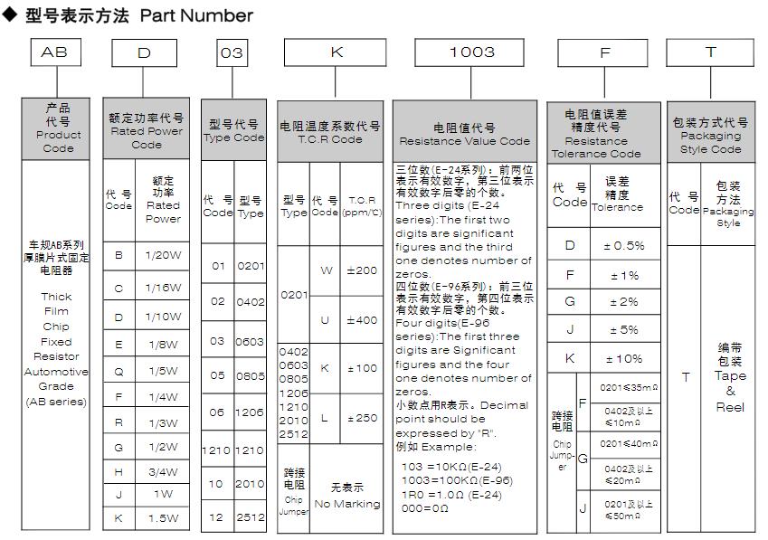 風華車規(guī)AB系列厚膜片式固定電阻器型號命名規(guī)則:
