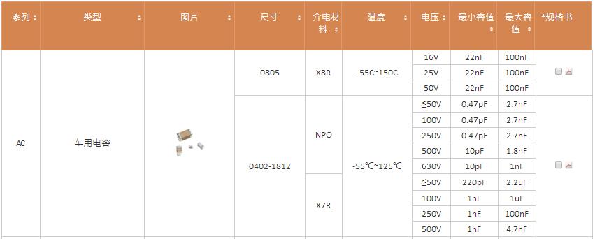 作為世界主要的積層陶瓷電容供貨商,國(guó)巨提供車用電容,AC系列。相較于泛用型陶瓷電容,AC系列其穩(wěn)定性符合AEC-Q200標(biāo)準(zhǔn)。車用電容包含AC, AS, AQ 及 AC HiTemp 系列。