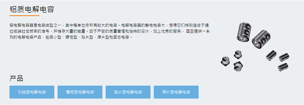 作為提供「一次購(gòu)足服務(wù)」的大型被動(dòng)組件供貨商,國(guó)巨提供完整的產(chǎn)品線,包括芯片電阻、積層陶瓷電容、導(dǎo)線電阻、無(wú)線組件、鋁質(zhì)電解電容和電感。國(guó)巨的多元化產(chǎn)品皆針對(duì)主要的垂直市場(chǎng)研發(fā),包括手機(jī)、平板計(jì)算機(jī)、網(wǎng)絡(luò)、家電、工業(yè)/電力、再生能源、醫(yī)療和汽車應(yīng)用。