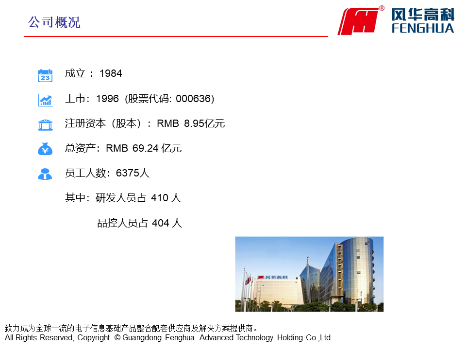 廣東風(fēng)華高新科技股份有限公司(證券簡(jiǎn)稱(chēng)風(fēng)華高科,證券代碼000636)成立于1984年,是一家專(zhuān)業(yè)從事高端新型元器件、電子材料、電子專(zhuān)用設(shè)備等電子信息基礎(chǔ)產(chǎn)品的高新技術(shù)企業(yè),1996年在深圳證券交易所掛牌上市。風(fēng)華高科自進(jìn)入電子元器件行業(yè)以來(lái),實(shí)現(xiàn)了跨越式的發(fā)展,現(xiàn)已成為國(guó)內(nèi)最大的新型元器件及電子信息基礎(chǔ)產(chǎn)品科研、生產(chǎn)和出口基地,擁有自主知識(shí)產(chǎn)權(quán)及核心產(chǎn)品關(guān)鍵技術(shù)的國(guó)際知名新型電子元器件行業(yè)大公司。